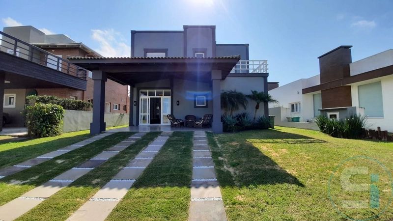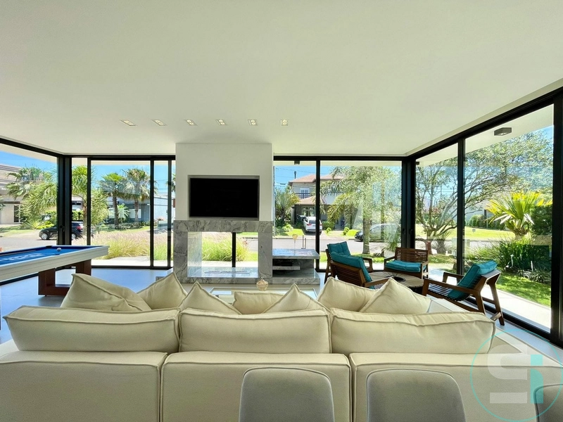 Belíssima casa térrea com pé direito alto, composto por 04 suítes, todas com porta-janela motorizadas para acesso ao pátio com deck de madeira nas saídas, living amplo com muita abertura para iluminação natural e circulação de ar, ar condicionado em todos os ambientes, inclusive living, cozinha estilo americana com churrasqueira, 02 lavabos, interno e externo, lavanderia, jardim com irrigação automática. Casa foi recentemente pintada, impermeabilizada e toda revisada. Está em perfeito estado de funcionamento.