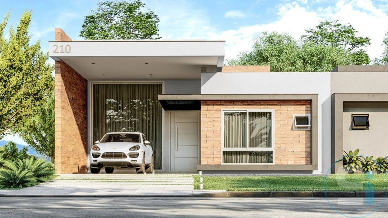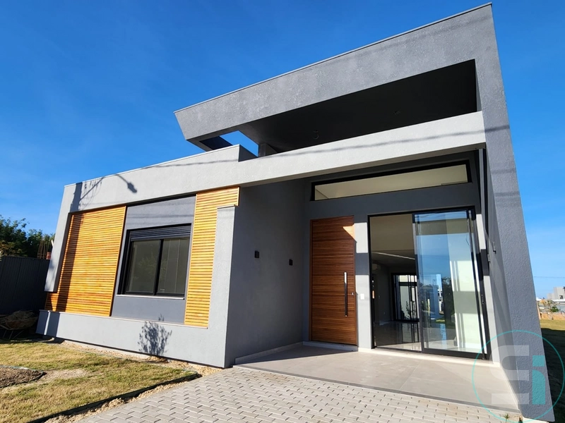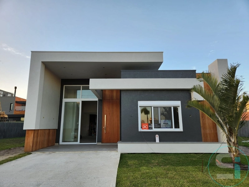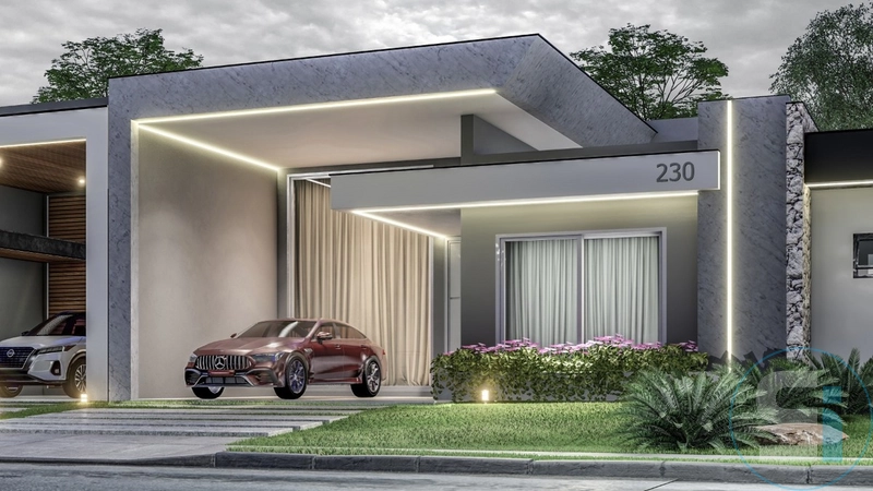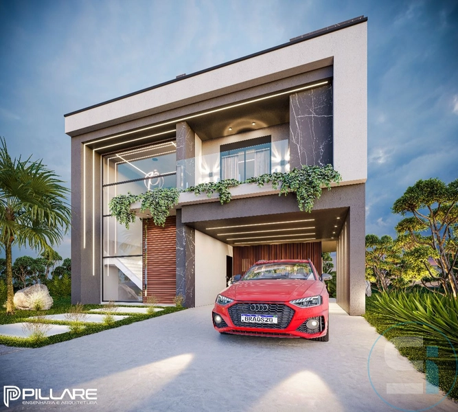 Belíssima casa térrea com projeto moderno, pé direito alto, composta por 03 suítes independentes, living integrado em 02 ambientes com lareira, lavabo social, churrasqueira, lavanderia, aberturas automatizadas em alumínio preto, frente Oeste, vagas para 02 carros.